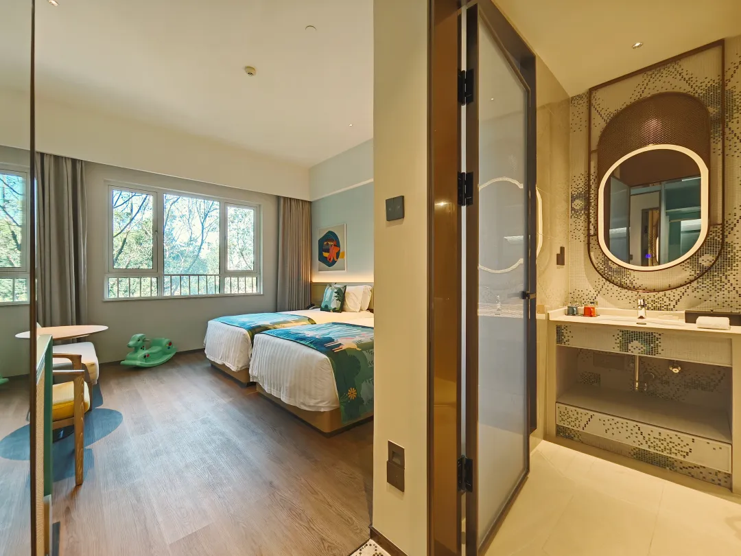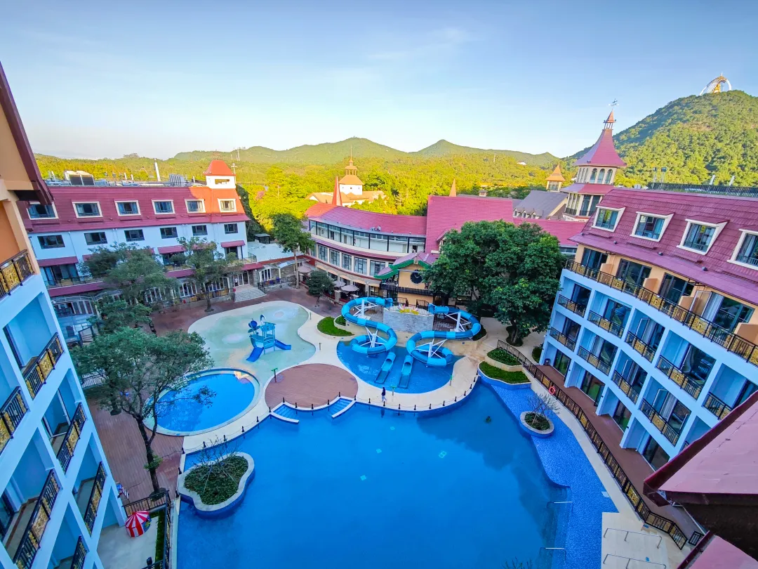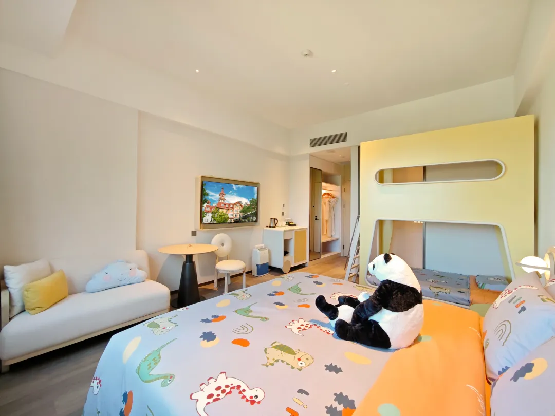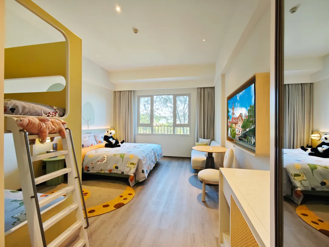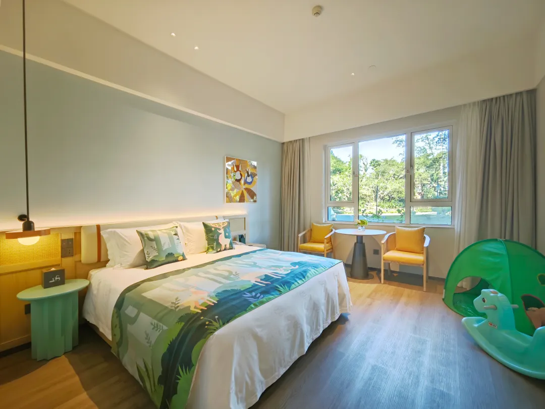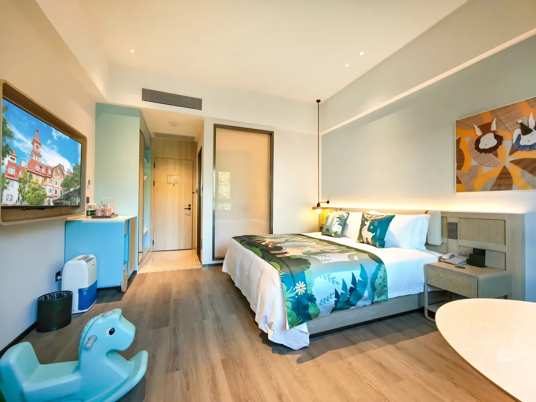 酒店拥有300间(套)客房,被森林绿意环绕又充满童话感的五彩城堡营造出温馨的童趣空间,在保持原有欧式童话建筑风格的同时,融入了丰富的亲子元素。