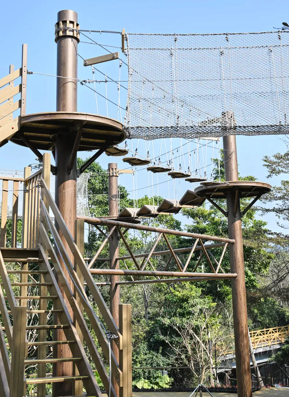 还有摇晃吊桥、狭窄平衡木、高难度攀爬网等